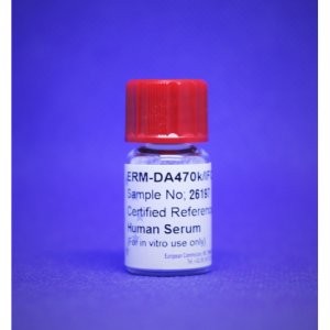 ERM-DA470k IFCC 樣本是添加(4-(2-hydroxyethyl)-1-piperazineethanesulfonic酸(HEPES)、疊氮.化鈉、鹽酸聯苯胺、氯化鈉和抑肽.酶的1.0 mL血清的凍干液。該材料保存在氮氣下的螺紋玻璃瓶與橡膠塞子和聚丙烯螺旋蓋。