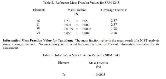 表 1 中報告了 SRM 1243 的 14 種成分的認證值,作為收到時的質量分數值 [1]。 NIST 認證值是 NIST 對其準確性具有最高置信度的值,因為所有已知或可疑的偏差來源都已被調查或考慮在內 [2]。價值分配分析由 NIST 和合作實驗室進行。