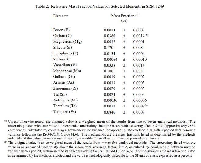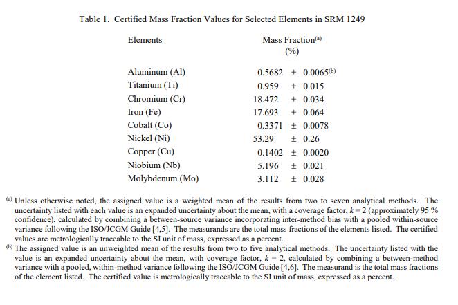 表 1 中提供了選定元素的認證質量分數值。所有值均以質量分數報告 [1]。 NIST 認證值是 NIST 對其準確性有最高置信度的值,因為所有已知或可疑的偏差來源都已調查或考慮在內 [2]。一個認證的值是根據 NIST 和合作實驗室使用表 4 中列出的測試方法進行的分析結果對真實值的當前最佳估計值。與值一起列出的不確定度是擴展不確定度(95 % 置信度)[3],根據計算得出ISO/JCGM 指南 [4] 中的方法。