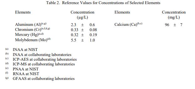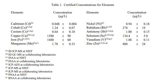 表 1 中提供了元素濃度的認證值。認證值基于 NIST 進行的主要分析技術的結果,或者 NIST 獲得的兩種或多種化學獨立分析技術的組合結果,以及合作專家實驗室 [2]。 NIST 認證值是 NIST 對其準確性具有最高置信度的值,因為 NIST 已調查或說明了所有已知或可疑的偏差來源。