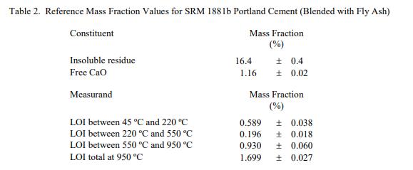 成分和燒失量 (LOI) 的參考值在表 2 中報告為質量分數。 NIST 參考值是未經認證的值,它是基于可用數據對真實值的當前最佳估計;但是,該值不符合 NIST 認證標準并提供相關的不確定性可能僅反映測量再現性,可能不包括所有不確定性來源,或者可能反映多種分析方法之間缺乏足夠的統計一致性 [2]。