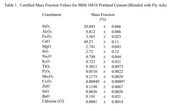 SRM 1881b 成分的認證值在表 1 中報告為質量分數 [1]。 NIST 認證值是 NIST 對其準確性具有最高置信度的值,因為所有已知或可疑的偏差來源都已被調查或考慮在內 [2]。認證值是存在的真實值的最佳估計。