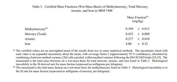 表 1 中提供了選定微量元素(包括總汞和甲基汞)的認證質量分數值。表 2 至表 4 中提供了選定 PCB 同系物、氯化農藥和 PBDE 同系物的認證質量分數值。痕量元素、多氯聯苯和氯化農藥的認證值基于從兩種或多種獨立分析技術獲得的結果。 NIST認證值是 NIST 對其準確性具有最高置信度的值,因為所有已知或可疑的偏差來源都已被調查或考慮在內 [1]。