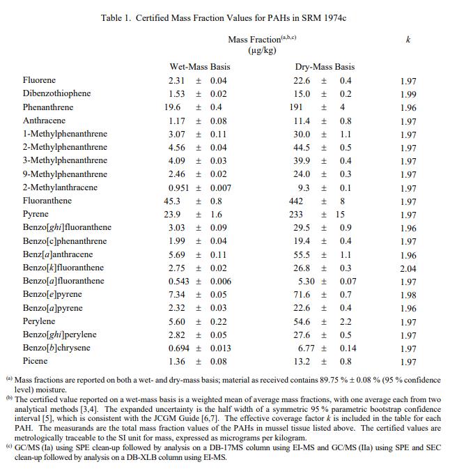 提供了 PAH(表 1)、PCB 同族物(表 2)、氯化農藥(表 3)、PBDE 同族物(表 4)以及汞和錫的認證質量分數值物種(表 5)。 NIST 認證值是 NIST 對其準確性具有最高置信度的值,因為所有已知或可疑的偏差來源都已被調查或考慮在內 [1]。認證值基于 NIST 使用多種分析技術獲得的結果的一致性。