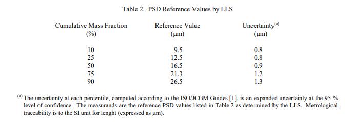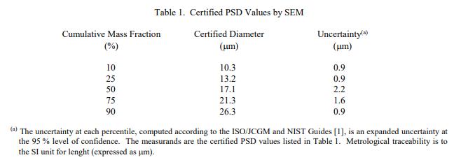 通過掃描電子顯微鏡 (SEM) 和激光散射 (LLS) 測量五個質量百分位數的 PSD 值。 SEM 認證的 PSD 值列于表 1。這些認證值是通過測量三個瓶子中的 10 000 多個單個顆粒而確定的。 LLS 的參考 PSD 值列于表 2。兩種方法的比較如圖 1 所示。 認證有效期:SRM 1984 認證在規定的測量不確定度內無限期有效,前提是樣品分散程序嚴格遵循(參見“光散射法的樣品色散和測量程序”)。不需要定期重新認證此 SRM。
