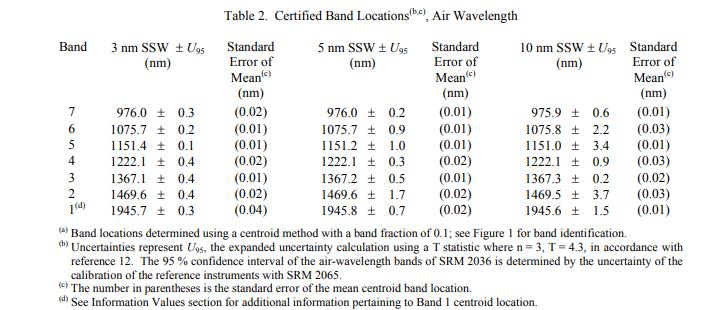 表 1 列出了 7 個反射吸收波段的認證真空波數位置,范圍從 10 300 cm-1 到 5 130 cm-1。7 個 NIR 空氣波長波段位置的認證值表 2 列出了從 976 nm 到 1946 nm 的反射吸收波段。 NIST 認證值是 NIST 對其準確性有最高置信度的值,因為所有已知或可疑的偏差來源都已被充分調查或考慮在內[1]。