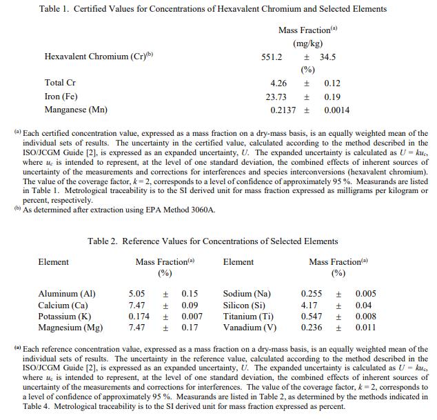 表 1 給出了 SRM 2701 中六價鉻、總鉻、鐵和錳的認證濃度。NIST 認證值是 NIST 在所有已知或可疑來源中對其準確性有最高置信度的值偏見已經被調查或考慮[1]。認證值基于兩種或多種獨立分析方法的結果一致。六價鉻的認證值是 NIST 和三個合作實驗室進行的分析測量的未加權平均值。該值基于使用經批準的美國環境保護署 (EPA) SW-846 分析方法(方法 3060A)從材料中提取的六價鉻,所有參與實驗室均使用該方法??傘t和鐵的認證值是 NIST 三種獨立分析方法結果的未加權平均值。錳的認證值是 NIST 兩種獨立分析方法結果的未加權平均值。