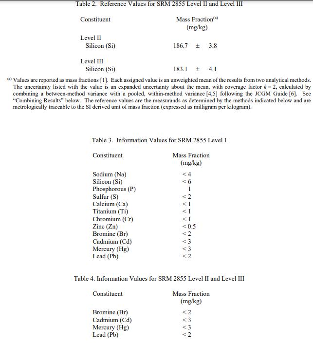 表 3 中報告了 SRM 2855 Level I 中成分的信息值。表 4 中報告了 SRM 2855 Level II 和 Level III 的信息值。信息值被認為是感興趣的值給 SRM 用戶,但沒有足夠的信息來評估與值相關的不確定性 [1]。信息值不能用于建立計量溯源性。