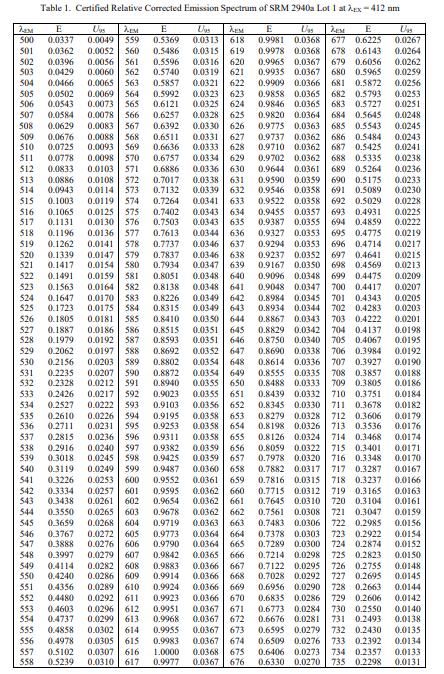 NIST SRM 2940a 熒光光譜的相對強度校正(標準品)NIST 參考值是非認證值,是對真實值的最佳估計;然而,這些值不符合 NIST 的認證標準,并且提供了相關的不確定性,這些不確定性可能僅反映測量精度,可能不包括所有不確定性來源 [1,2]。