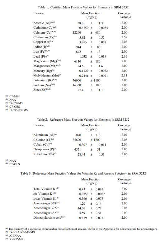 表 2 中的附加元素、表 3 中的葉綠醌(維生素 .K1)和砷物質以及表 4 中的近似值提供了基于干質量報告的參考質量分數值;表 4 還提供了基于干重的卡路里參考值。NIST 參考值是未經認證的值,它是基于可用數據對真實值的最佳估計;然而,價值不符合NIST 認證標準,并提供了可能不包括所有不確定性來源的不確定性 [1]。參考值來自 NIST 或合作實驗室報告的結果。參考值是 NIST 的未加權平均值或合作者報告的方法平均值。擴大的不確定度計算為 U = kuc,其中組合不確定度 uc 包含方法結果之間觀察到的差異、方法不確定度和水分校正的不確定度分量,與 ISO/JCGM 指南及其增補 1 [2-4] 一致。覆蓋因子 k 對應于大約 95% 的置信水平。