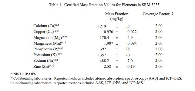 表 1 和表 2 提供了 SRM 3235 中元素和維生素的認證質量分數值,按原樣報告,在表 1 和表 2 中提供。 NIST 認證值是 NIST 對其最有信心的值準確性,因為所有已知或可疑的偏差來源都已被調查或考慮到[1]。價值分配分析由 NIST 和合作實驗室進行。