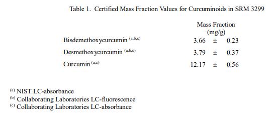 表 1 和表 2 提供了 SRM 3299 中姜黃素和元素的認證質量分數值,以干質量為基礎報告。NIST 認證值是 NIST 對其準確度有最高置信度的值因為所有已知或可疑的偏見來源都已被調查或采取考慮[1]。價值分配分析由 NIST 和合作實驗室進行。認證值計算為 NIST 方法平均值的未加權平均值和合作實驗室平均值的加權中值(在適當的情況下)。相關的不確定性以大約 95% 的置信水平表示 [2-4]。
