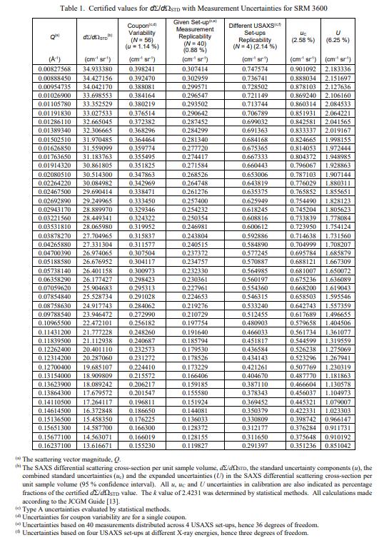 NIST SRM 3600小角度X射線散射強度校準(標準品)旨在用于小角度 X 射線散射 (SAXS) 儀器的散射強度校準。 SAXS 測量表征了異質材料系統的微觀結構和納米結構:特別是微米級和納米級特征的尺寸分布,以及散射強度校準,它們的體積分數或數量濃度,以及它們的表面積 [1]。