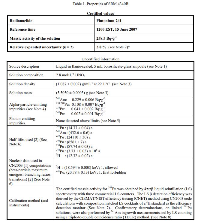 標準參考物質 NIST SRM 4340B - 钚-241放射性標準